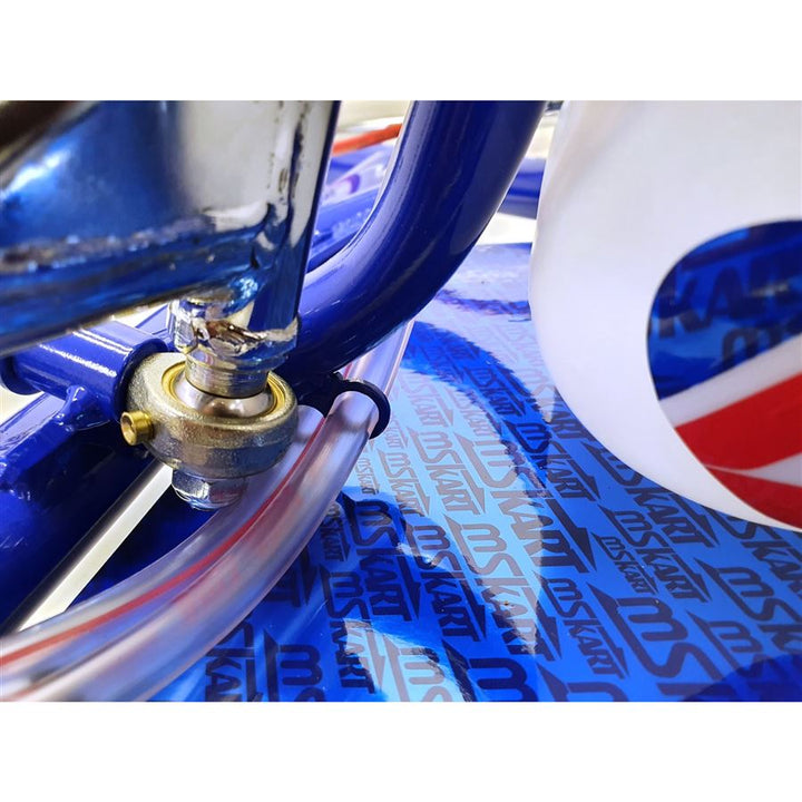 The Blue Swift EVO chassis has international CIK / FIA homologation valid for all categories (homologation number 008-CH-88). The frame of diameter 32 mm is made of high quality chrome-molybdenum steel tubes. The latest version of the frame has a modified front axle geometry which enables both a more variable adjustment of the rear end ground clearance and the set up of the stub axles height. New for 2025 is the option of an adjustable wheelbase of 1045 +/-10 mm and new rear axle bearing housings. It is very easy to set up the camber castor of the front wheels by using the popular Sniper adjusters. An other new feature is the EL.ZET hydraulic brake system with self-ventilated floating brake disc. The KG 509/507 bodywork in combination with the latest design of MS KART stickers provides the MS Blue Swift EVO chassis an attractive look.